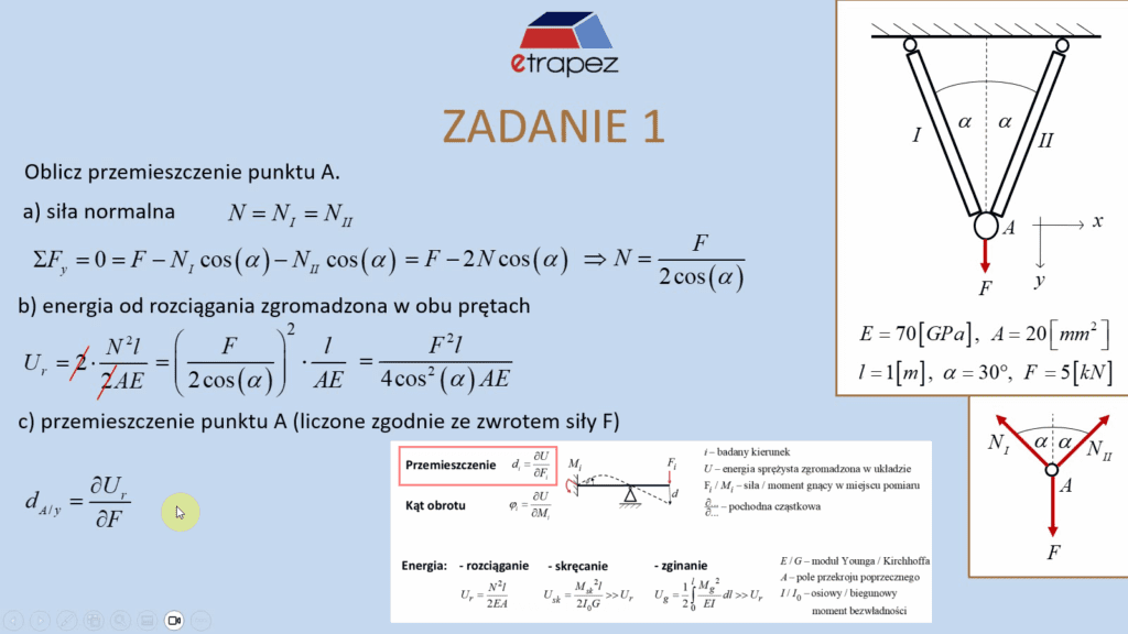 Lekcja pierwsza dotyczy twierdzenia Castigliano. Omawiam tu wyznaczanie przemieszczenia lub też kąta obrotu belki, ramy czy też kratownicy, gdy układ jest statycznie wyznaczalny.