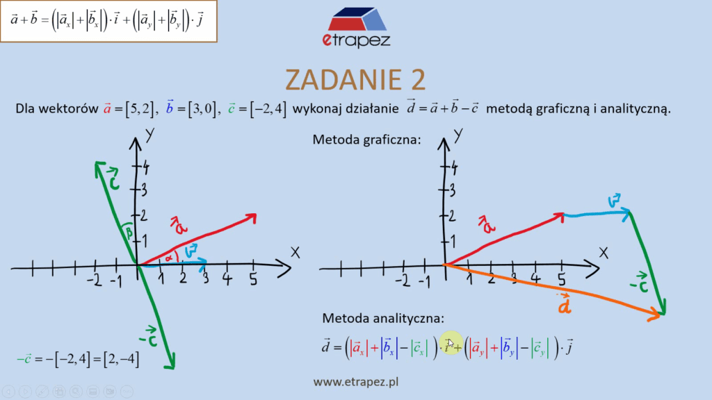 - zadanie 2: dodawanie i odejmowanie wektorów, graficznie i analitycznie (obliczeniowo) [49:38]