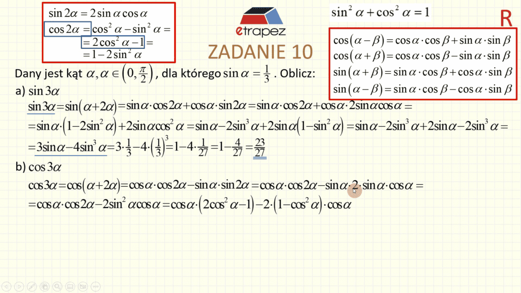 - Zadanie 10: podany sinus, wartość potrojonego kąta sin(3a), cos(3a) – 2 przykłady [1:35:23]