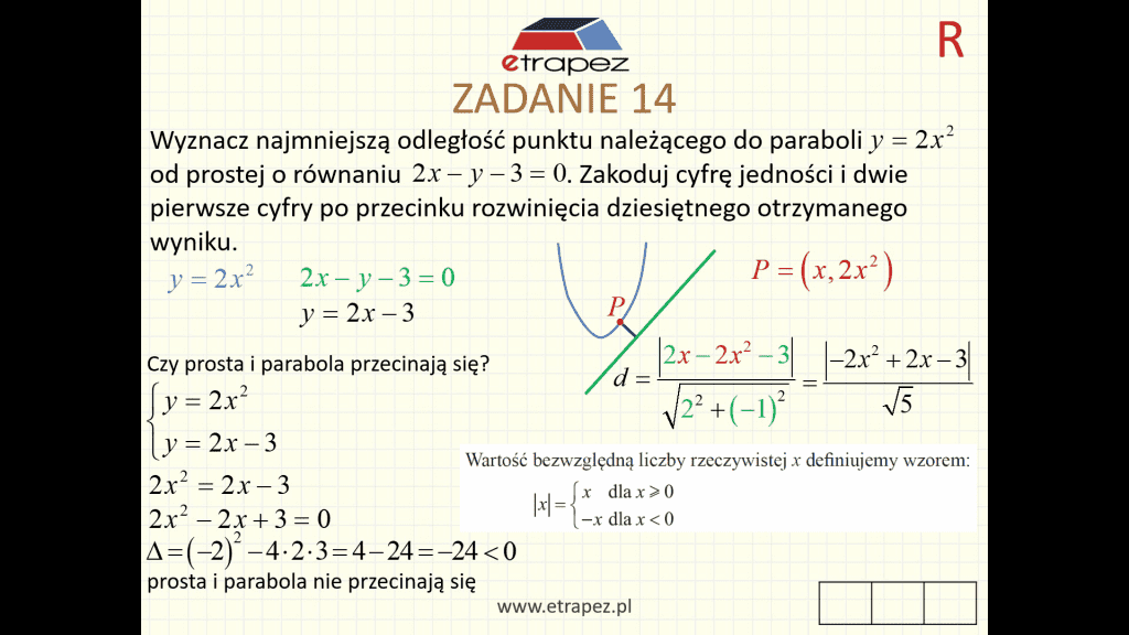 - Zadanie 14: najmniejsza odległość punktu leżącego na paraboli od prostej [1:38:52]