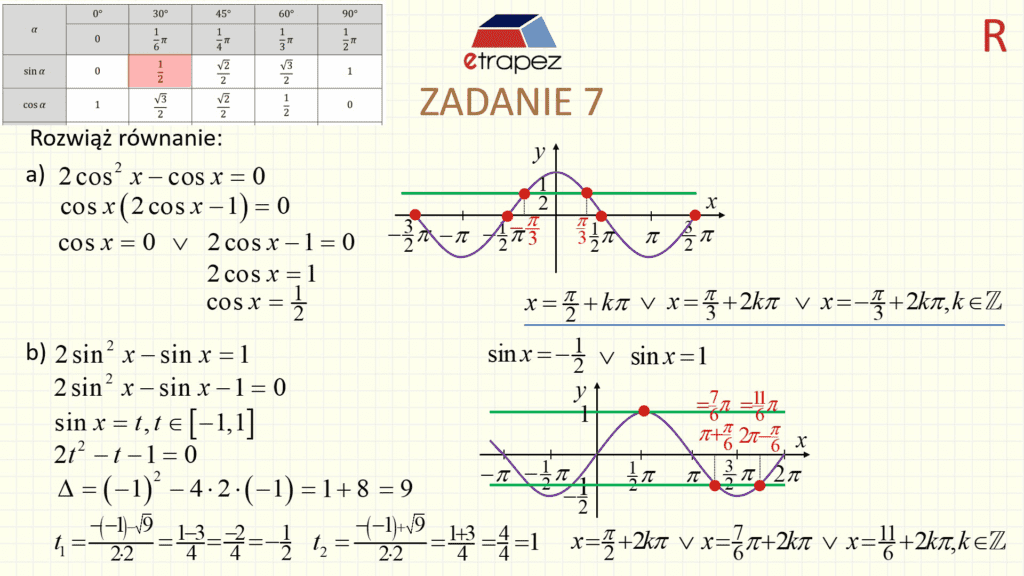 - Zadanie 6: równania trygonometryczne w określonym przedziale – 4 przykłady [1:32:29]