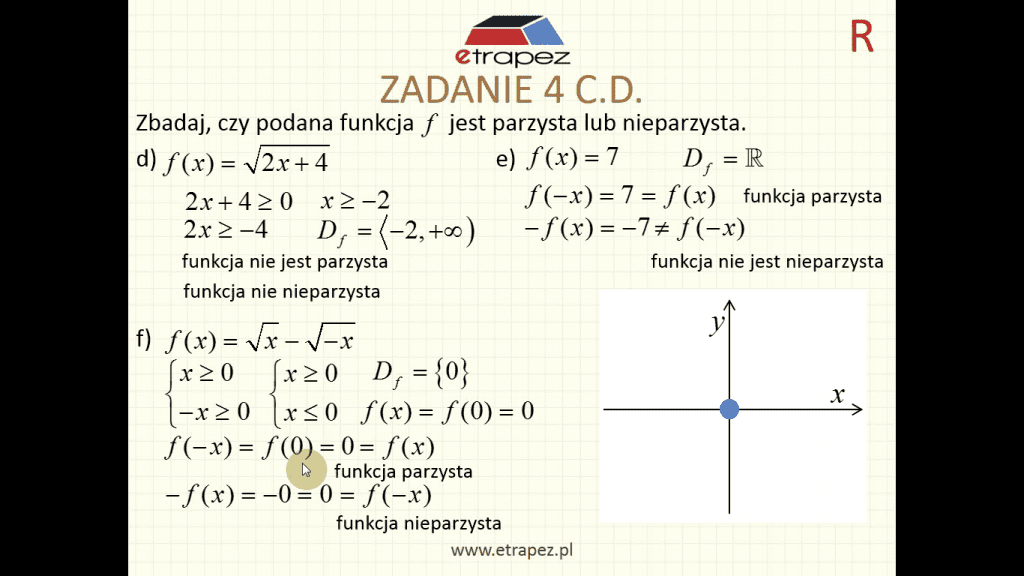 • zadanie 4: na badanie, czy funkcja jest parzysta lub nieparzysta – 7 przykładów [1:15:39]