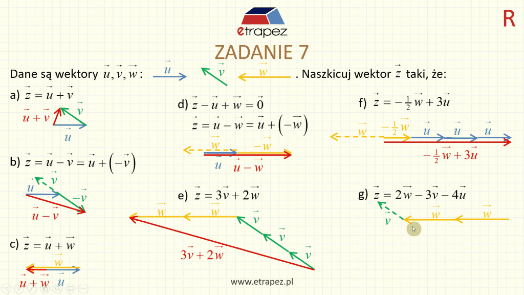 - Zadanie 7: działania na zadanych wektorach – 7 przykładów [1:48:00]