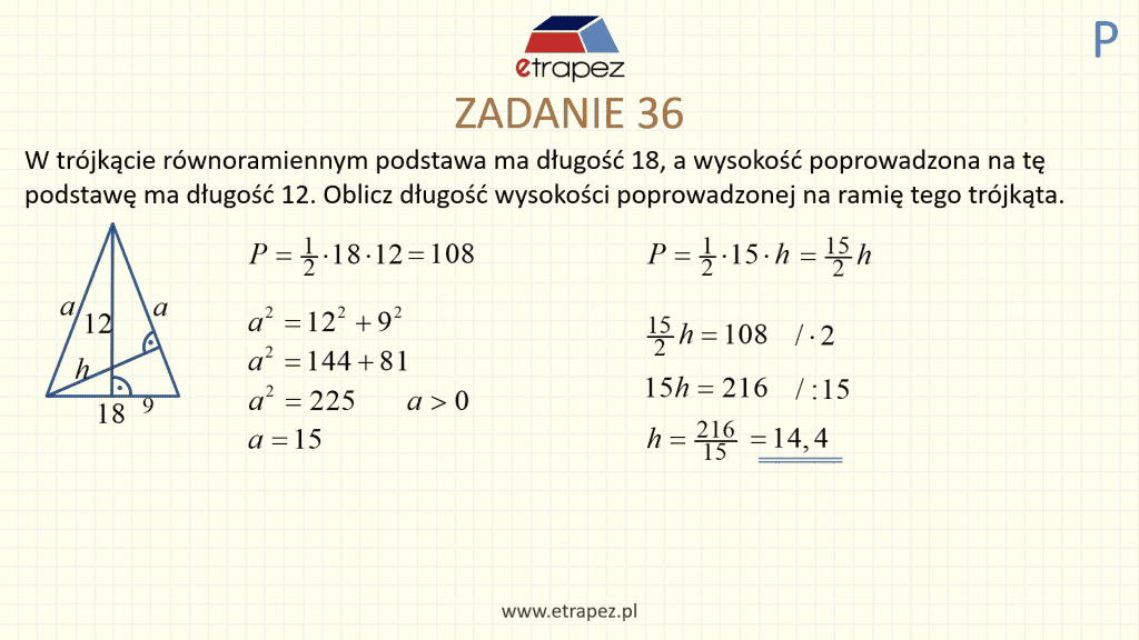 - Zadanie 36: zastosowanie wzoru na pole w trójkącie równoramiennym, wyznaczenie wysokości padającej na ramię [13:53]