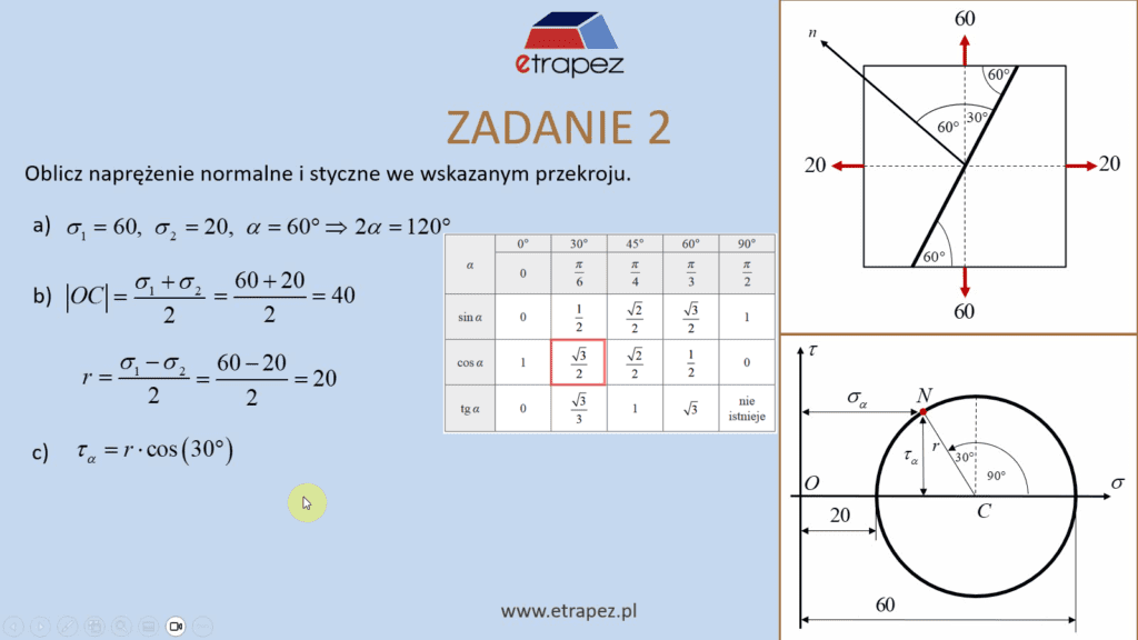 - zadanie 1: naprężenie normalne i styczne we wskazanym przekroju, analitycznie [16:33]