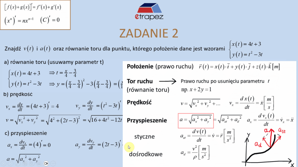 - zadanie 2: prędkość, przyspieszenie oraz równanie toru dla punktu o zadanym położeniu (ruch w osi OX i OY) [18:23]