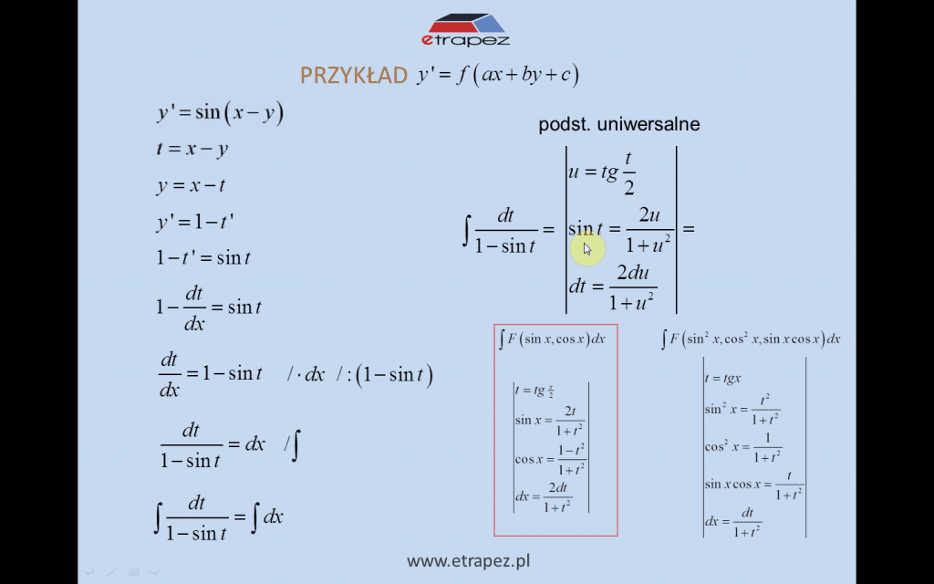 • rozwiązywanie równań typu y’=f(ax+by+c) – przykład 4 [32:52]