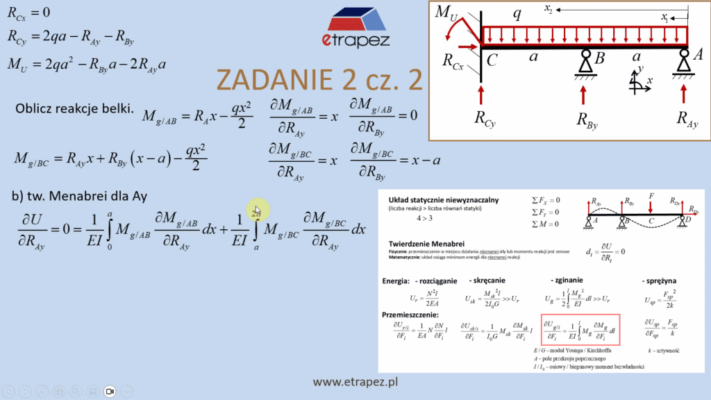 Lekcja druga stanowi uzupełnienie Lekcji pierwszej i dotyczy twierdzenia Menabrei. Omawiam tu wyznaczanie przemieszczenia lub też kąta obrotu belki, ramy czy też kratownicy, gdy układ jest tym razem statycznie niewyznaczalny.