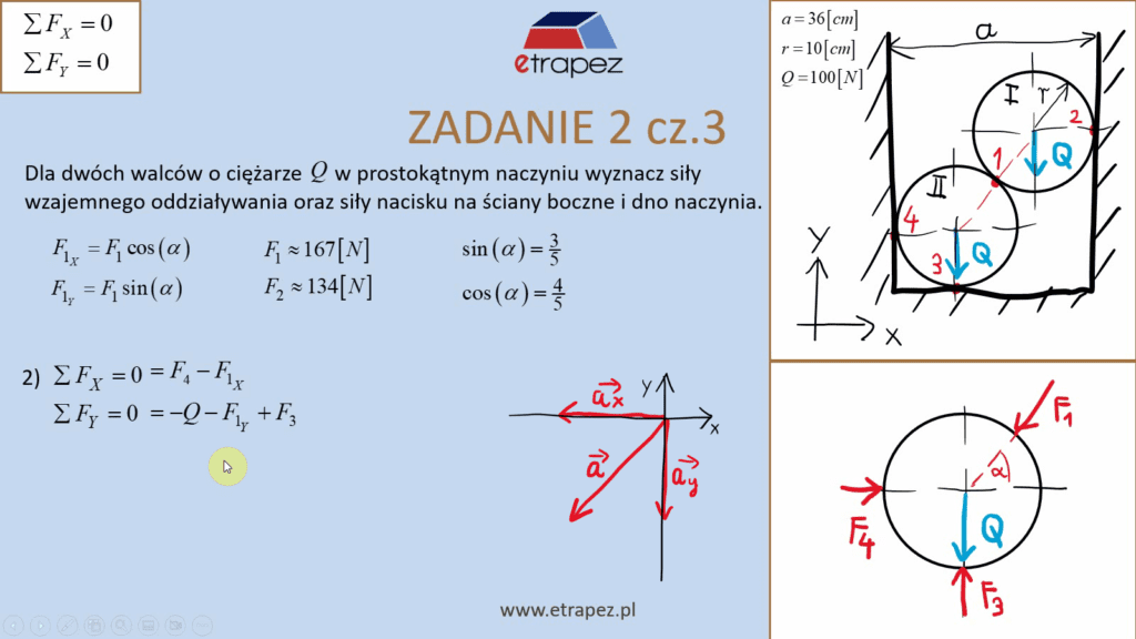 - zadanie 2: dwa walce umieszczone w naczyniu, siły wzajemnego oddziaływania oraz siły nacisku na ściany naczynia [21:19]