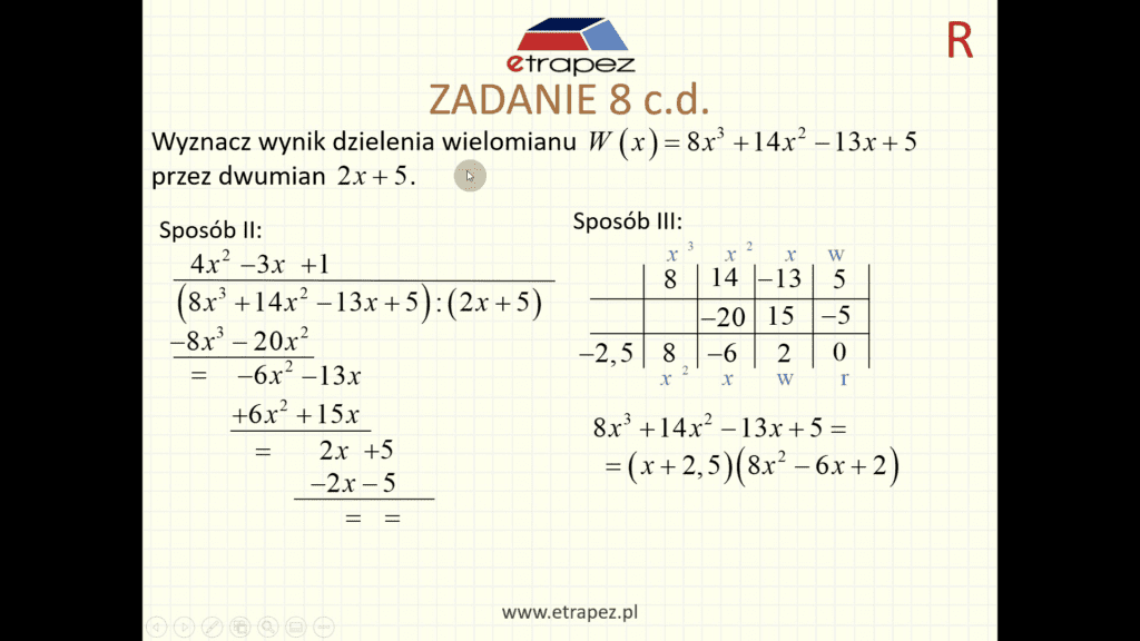 • Zadanie 8: wielomiany – dzielenie wielomianów (3 sposoby: rozkład na czynniki, dzielenie pisemne wielomianów, schemat Hornera) [34:58]