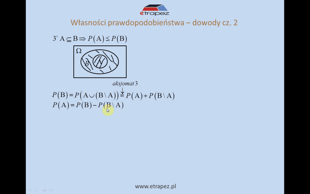 • prawdopodobieństwo jako zbiór (relacja między zdarzeniami) – przykład 4 [41:44]