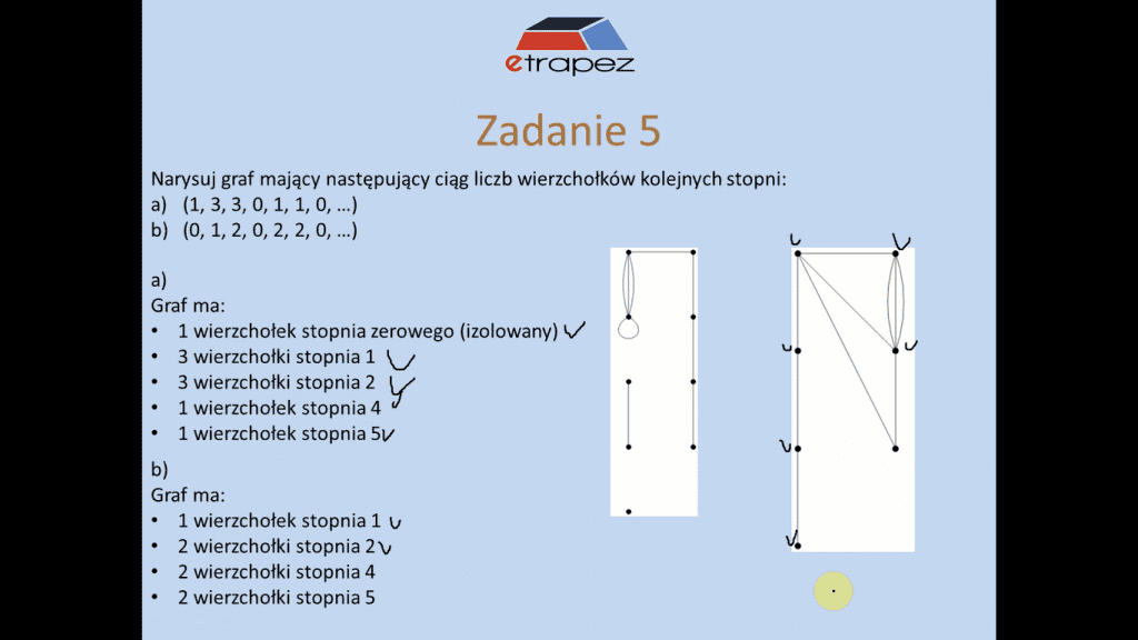 - zadanie 5: rysowanie grafów z zadanego ciągu liczb wierzchołków kolejnych stopni – 2 przykłady [1:15:39]