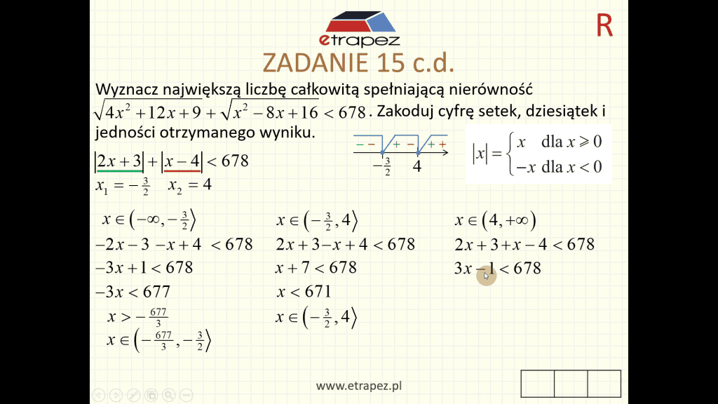- Zadanie 3: nierówność z wartościami bezwzględnymi (pierwiastek z kwadratu) [17:10]