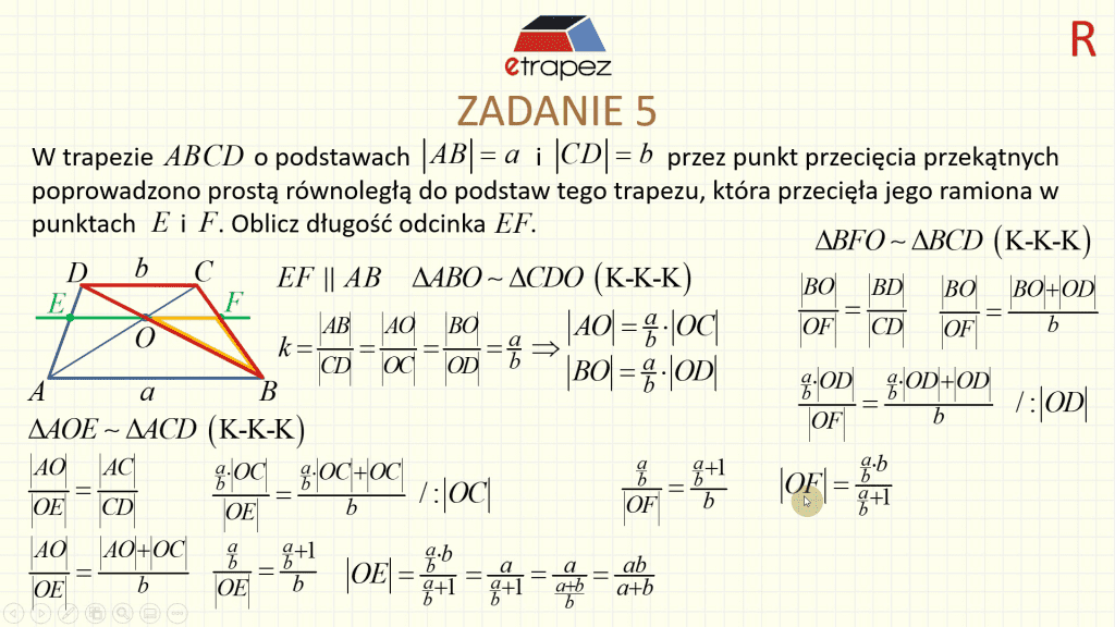 - Zadanie 5: trapez o podstawach a i b, obliczenie długości odcinka równoległego do podstaw, przechodzącego przez punkt przecięcia przekątnych [26:34]