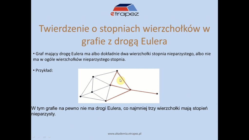 • warunki wystarczające istnienia drogi i cyklu Eulera z przykładami (twierdzenie o istnieniu drogi i cyklu Eulera) [32:04]