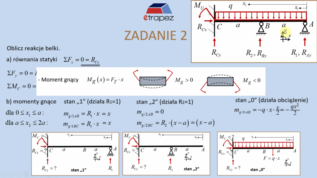 - zadanie 2: reakcje belki (siły reakcji oraz momenty reakcji), dwie podpory oraz utwierdzenie, obciążenie stałe; dwie nieznane reakcje [39:09]