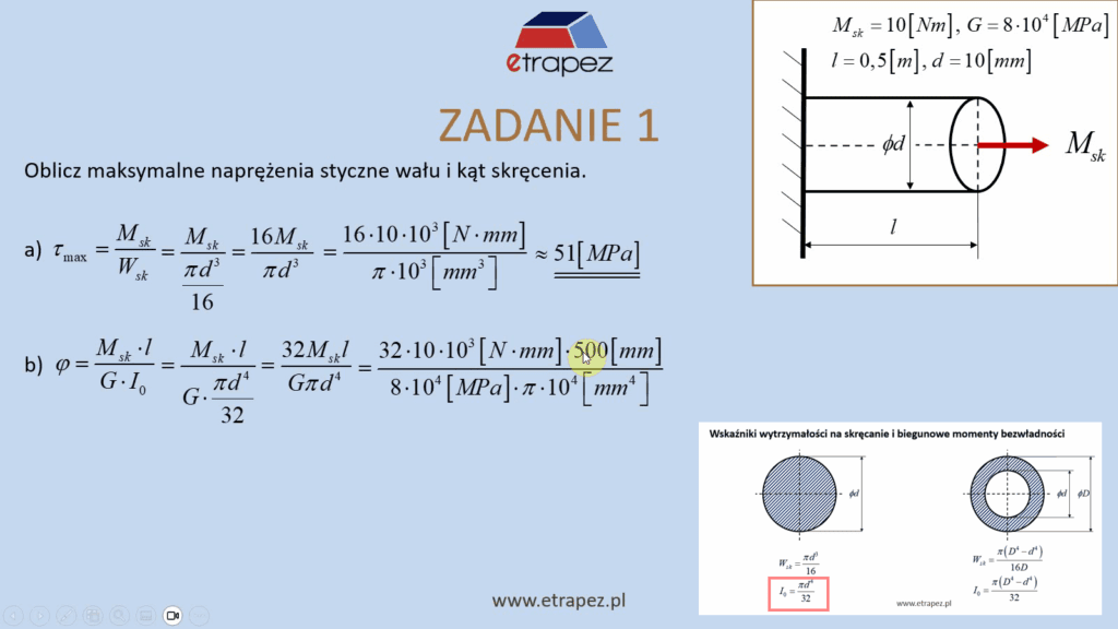 • zadanie 1: maksymalne naprężenia styczne wału i kąt skręcenia [10:41]