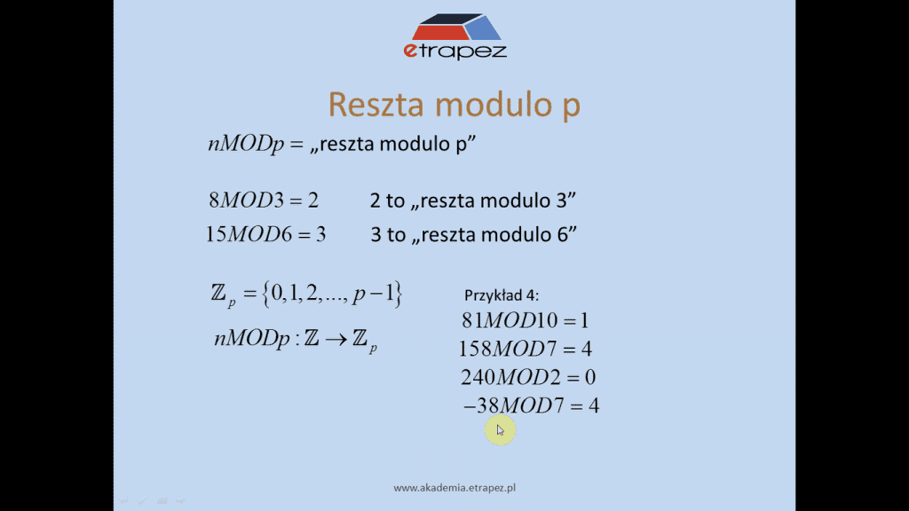 • pojęcie MOD jako „reszty modulo p” [18:09]
