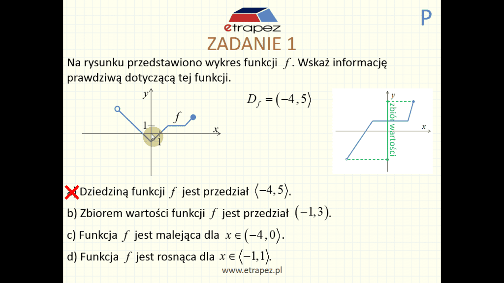 - Zadanie 24: własności funkcji z wykresu (dziedzina, zbiór wartości, monotoniczność) [2:00:16]