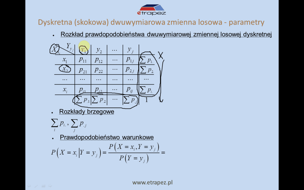 - charakterystyki dwuwymiarowej zmiennej losowej dyskretnej (rozkład, rozkłady brzegowe i warunkowe, wartości oczekiwane, wariancje, kowariancja, współczynnik korelacji) [06:17]