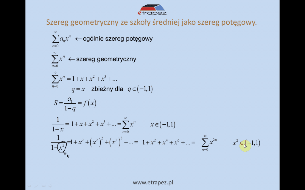 • suma szeregów potęgowych (wykorzystując szereg geometryczny) – przykład 7 [02:19:52]