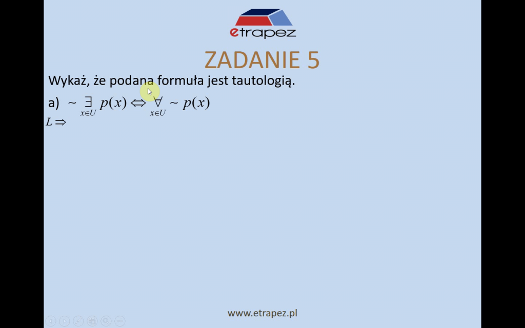 - zadanie 7: zapisywanie praw kwantyfikatorów w języku naturalnym (2 przykłady) [1:46:04]