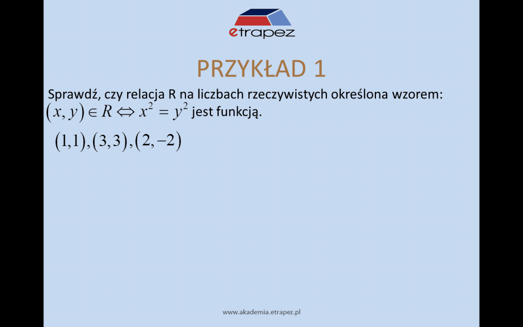 Materiał video ma prawie 20 minut i 5 przykładów na sprawdzanie, czy relacja jest funkcją.