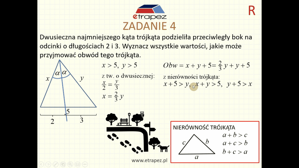 - Zadanie 4: szacowanie obwodu trójkąta, zależności na katach, twierdzenie o dwusiecznej, nierówność trójkąta [27:21]
